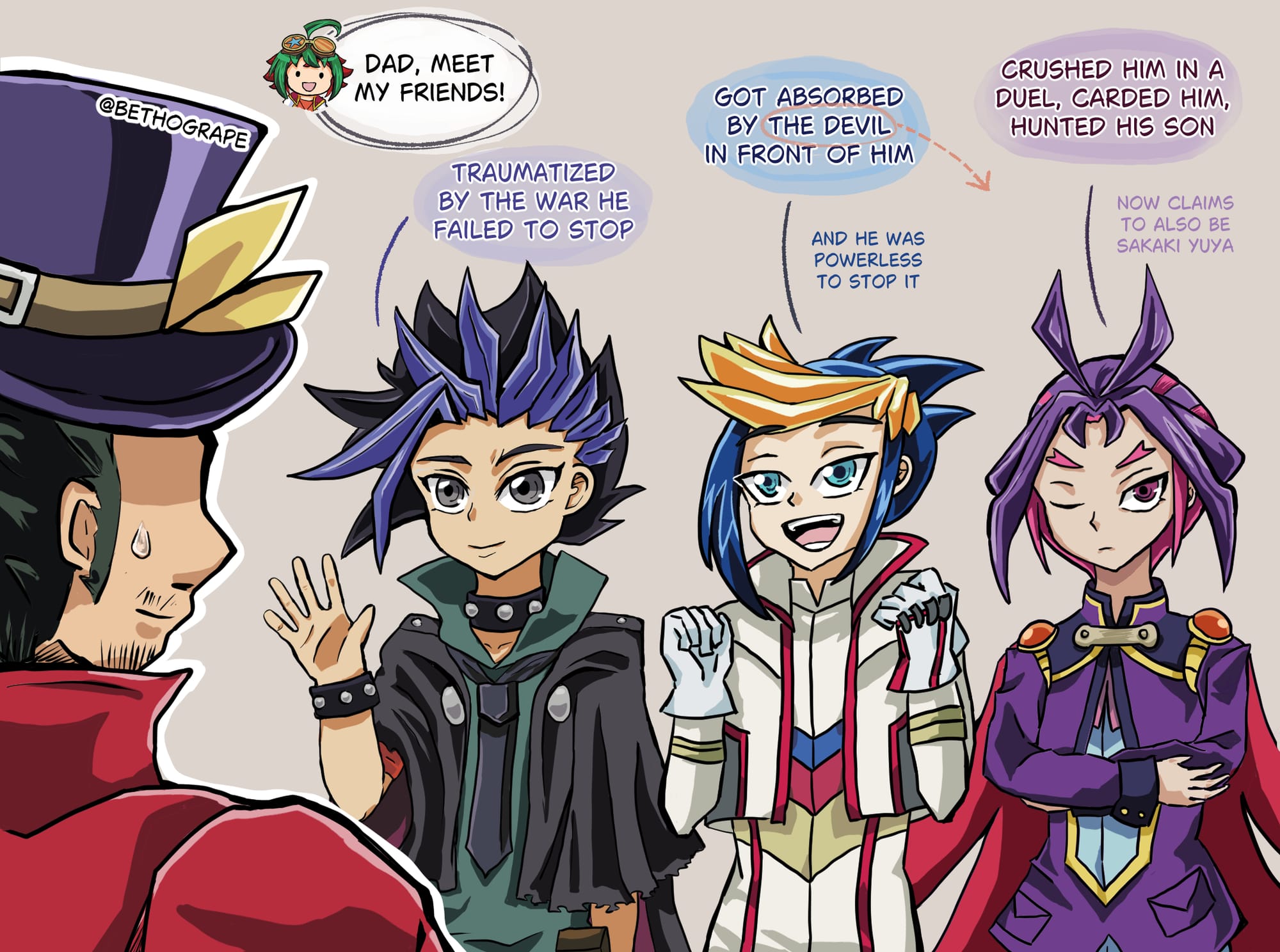 Speaking of which, Yusho actually never met Yuto in person during the show, even though he spread his egao philosophy to Yuto (through Ruri). His encounter with Yugo in the Academia was super brief too, the Arc-V anime truly has an extremely large cast (and filler episodes) that limits the screen time for side characters….
